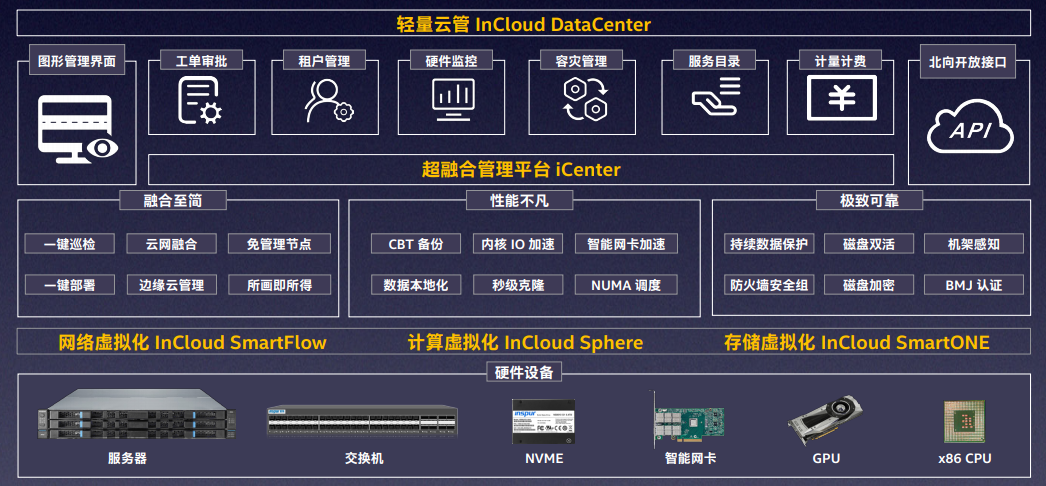 • 集成于超融合一体机中,能够通过一体机所预置的虚拟化平台、云管理平台、快速部署工具以及相关的工作流程,显著简化部署、管理和运维工作的复杂性。