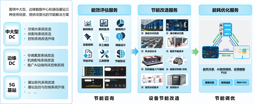 围绕中大型中心 香蕉视频国产,边缘中心,5G基站三种场景,以“平台+服务”,为客户提供数据中心节能咨询,节能改造,能耗优化等节能优化服务。